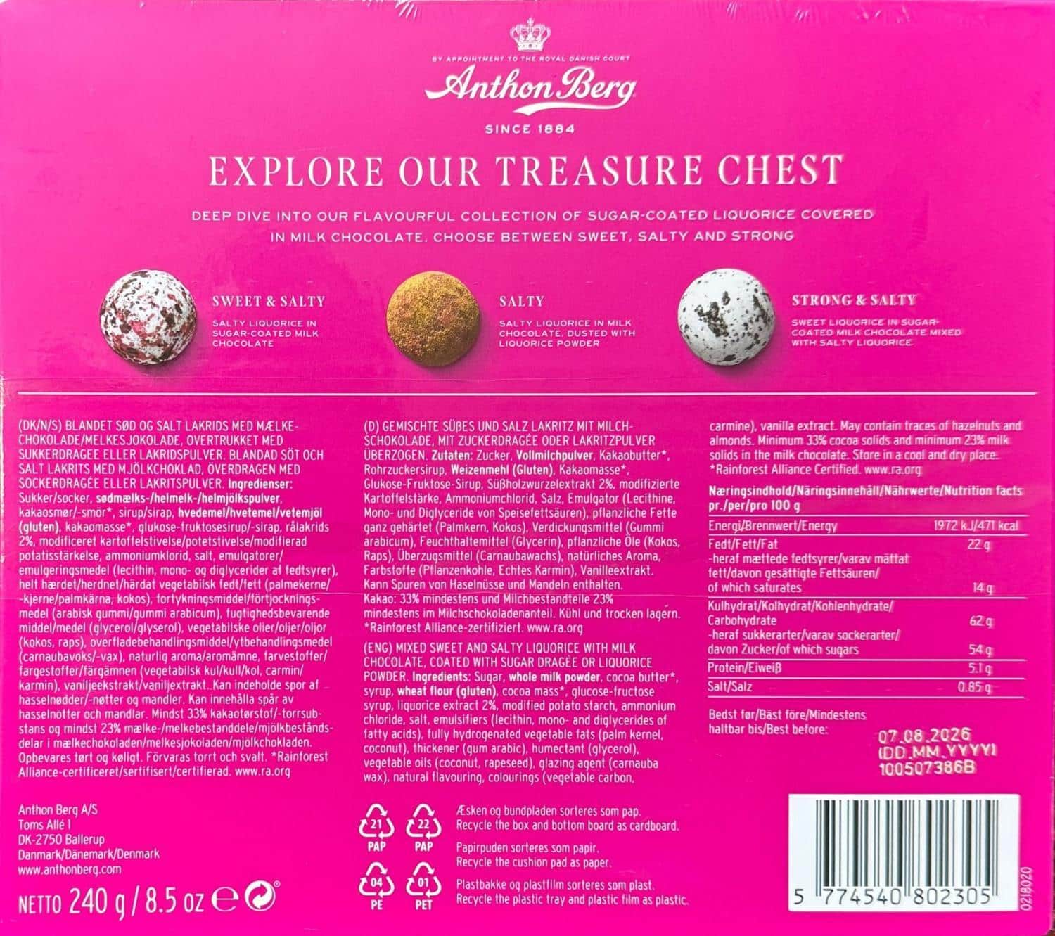 Anthon Berg Liquorice Treasures er en konfekteske som inneholder sjokolade dekket lakriskuler! Det er tre forskjellige smaker; Sweet & Salty, Salty og Strong & Salty