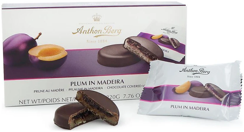 Marsipan med en kjerne av plummemarmelade og Madeira vin, dekket med et lag av mørk sjokolade.