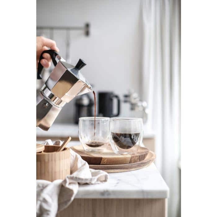 Slik tilbereder du kaffe: fyll kjelen opp til sikkerhetsventilen med vann, sett inn trakten og tilsett espressomalt kaffe: lukk moka-kannen og sett den på koketoppen. Vent til kaffen koker mens den stiger til oppsamleren (øvre kammer), slå av komfyren og til slutt nyt den deilige kaffen din!