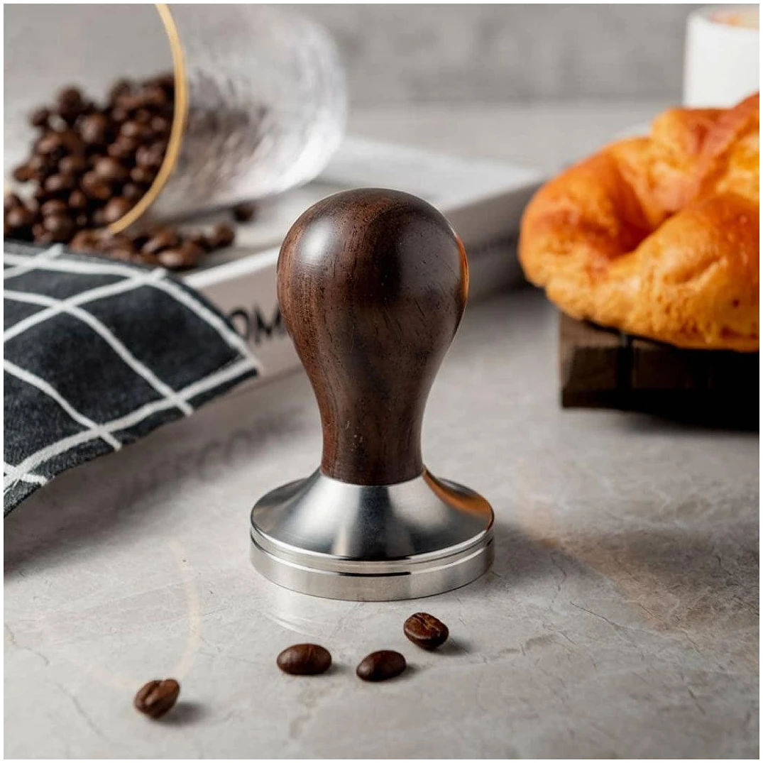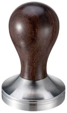 Tamper med flat 58mm base i stål og håndtak i tre.