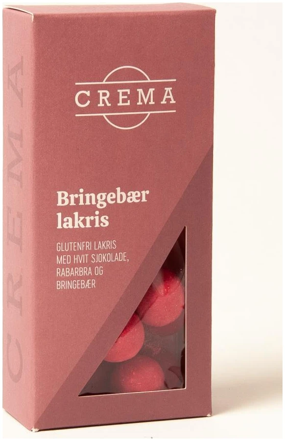 Ingredienser: Sukker, kakaosmør, melkepulver, sirup, maismel, invertsukker, lakris (1,7 %), salt, frysetørret bringebær, sitronsyre, aroma (vanilje, rabarbra), stabilisator (E420), konserveringsmiddel (E202), emulgator (E322 soyalecitin), fargestoff (E100, E120), overflatebehandlingsmiddel (kokosolje, E903)