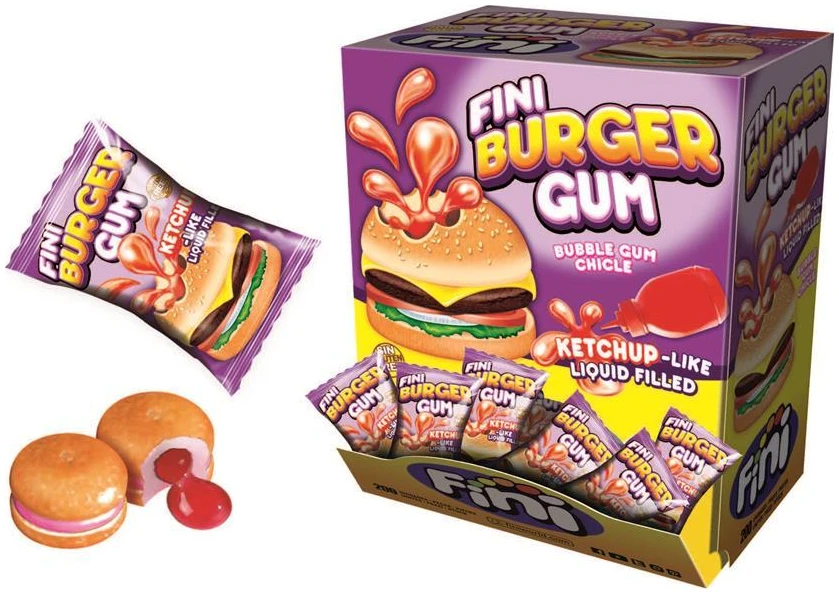 Tyggegummi formet som en burger med flytende kjerne av tutti fruttismak fra Fini.