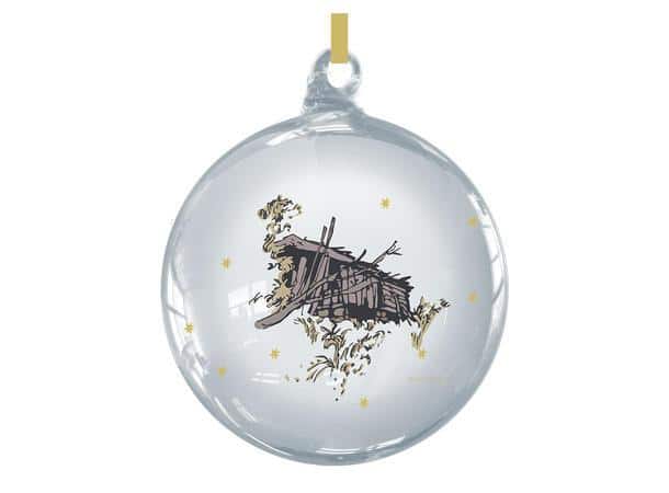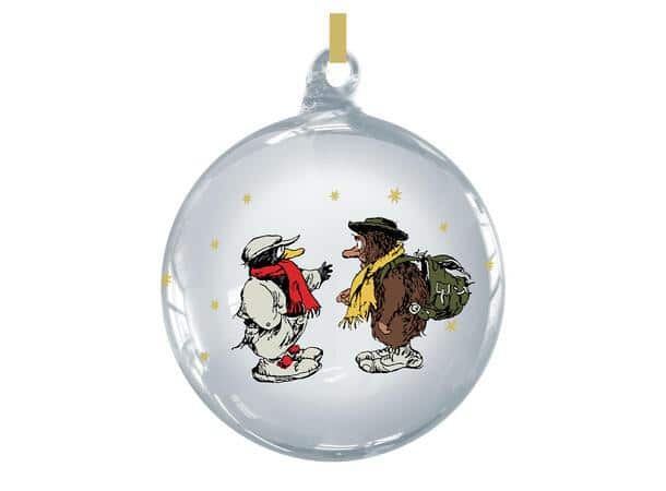 Flåklypa julekule med motiv av Ludvig og Solan. Dekorasjonskulen i glass med satengbånd er laget av mummblåst blyfritt glass. Julekulen er stilren som passer på årets juletre eller andre steder i hjemmet!