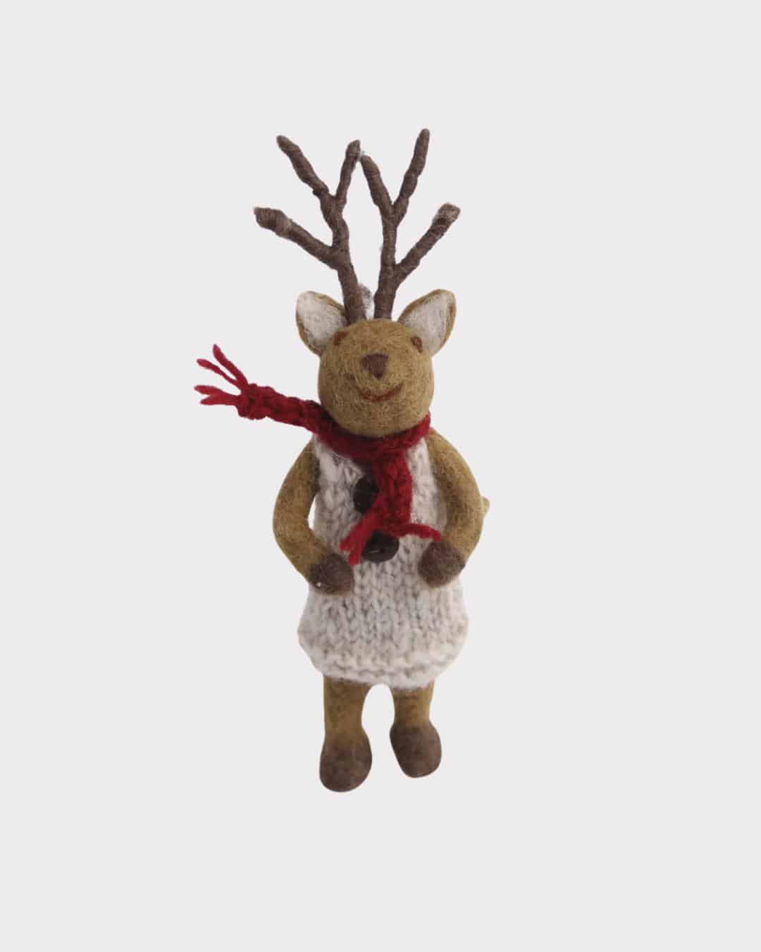 Varmt pakket inn i en koselig grå kjole og skjerf, er vår lille brun jentehjort med grå kjole og skjerf her for å bringe festlig sjarm til vinterhjemmet ditt. Et hjertevarmende tilskudd som legemliggjør magien med skandinavisk design og nepalsk håndverk. Fra Gry & Sifs reinsdyrfamilie.
