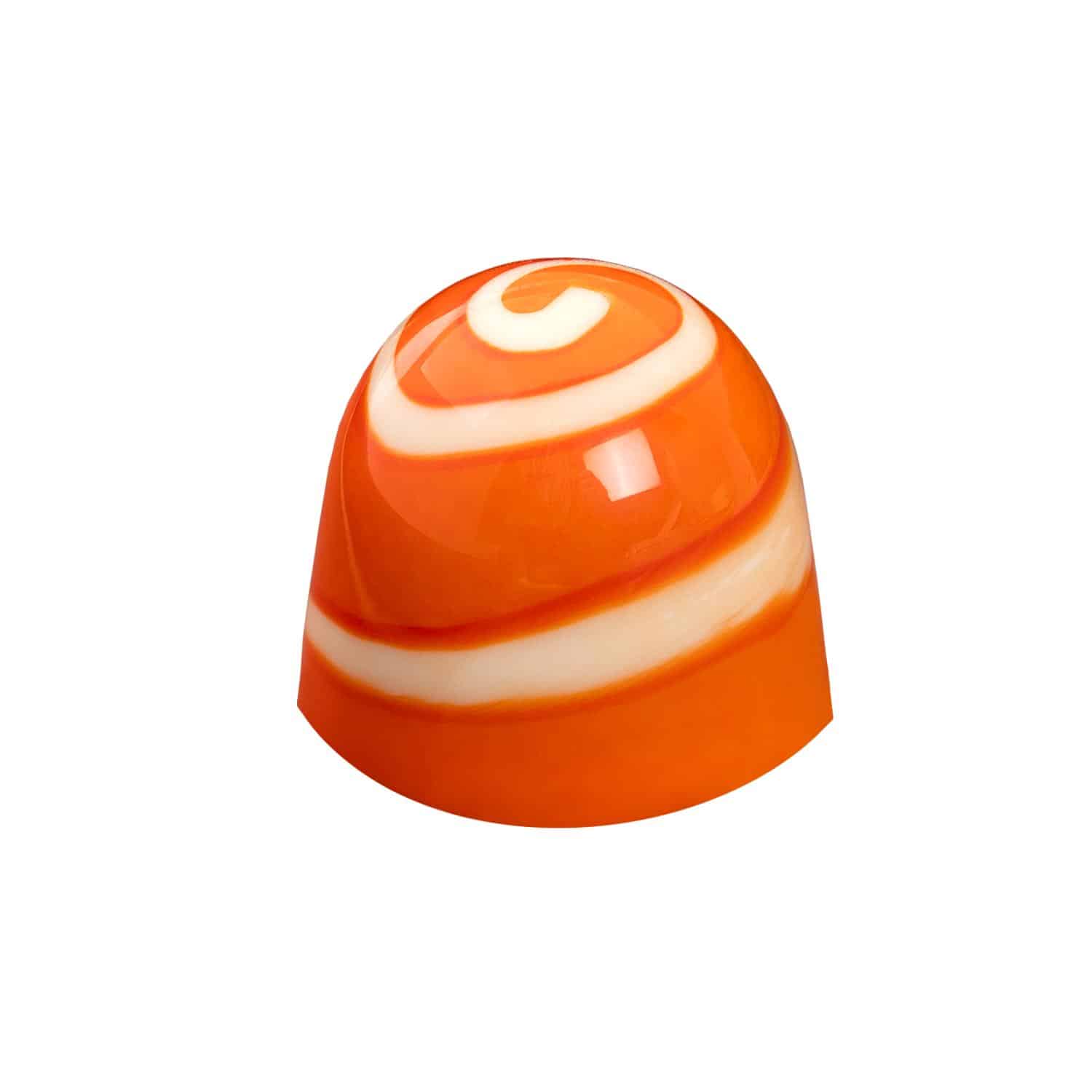 Jentene på tunet sin Appelsinsplæsj. En fylt sjokoladebit med appelsin i kombinasjon med både hvit og mørk sjokolade.