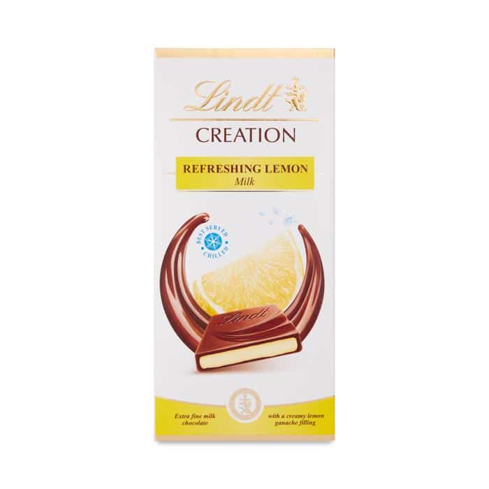 Lindt Creation Refreshing Lemon er en deilig sjokoladeplate med kremet sitronganache fyll pakket inn i fløyelsmyk melkesjokolade, som gir en unik og herlig smaksopplevelse!