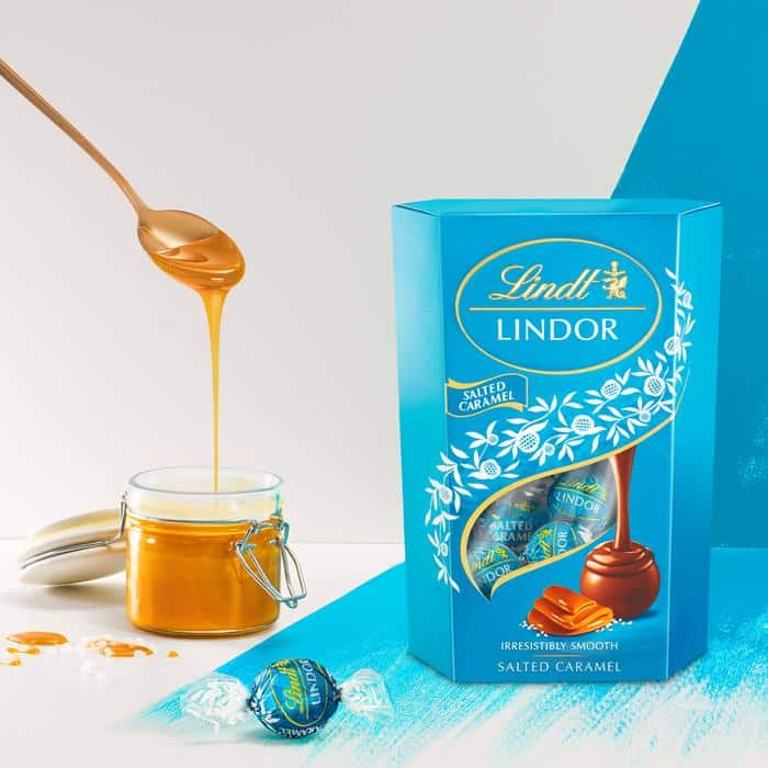 Lindt Lindor Salted Caramel. Sjokoladepraline med kremet og mykt karamellfyll, dekt av et delikat melkesjokoladeskall med smak av havsalt.