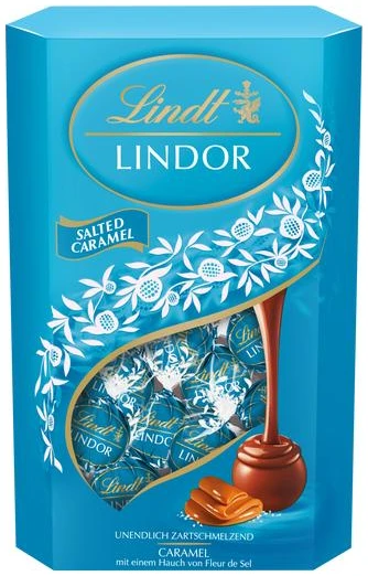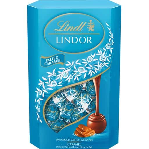 Lindt Lindor Salted Caramel. Sjokoladepraline med kremet og mykt karamellfyll, dekt av et delikat melkesjokoladeskall med smak av havsalt.