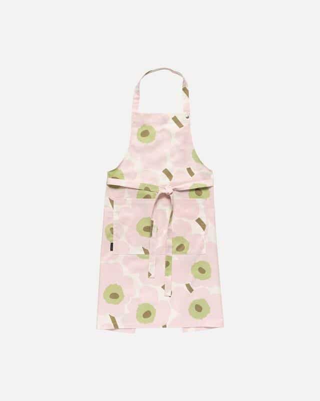 Pieni Unikko-mønsterforkleet er trykket i Helsingfors. Forkleet har en lomme foran og en justerbar halsringning.