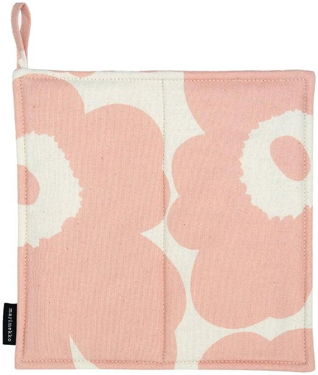 Denne grytekluten er laget av ubleket bomull og har Pieni Unikko-mønsteret. Grytekluten har polstret fyll og opphengsløkke.