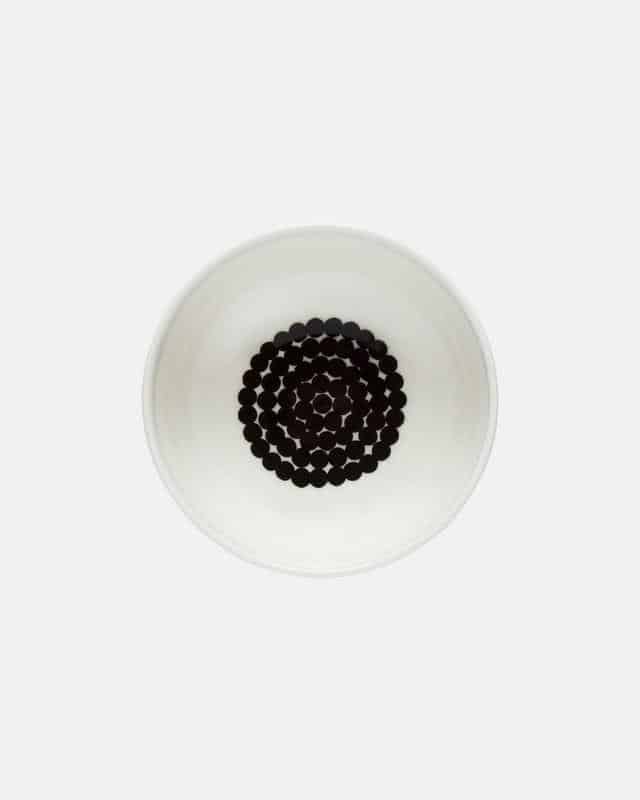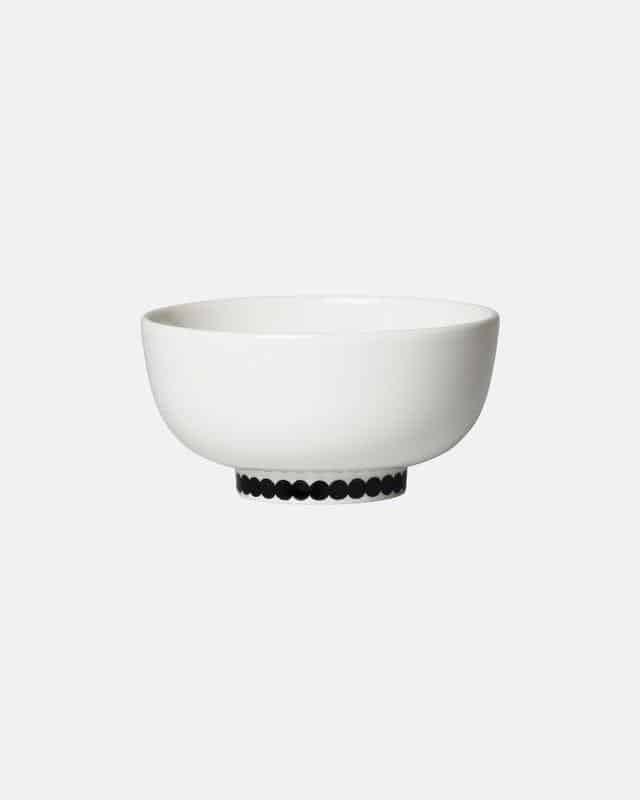 Denne lille Oiva-risbollen er dekorert med det svart-hvite Räsymatto-mønsteret og er laget av hvitt steintøy som tåler oppvaskmaskin, stekeovn, mikrobølgeovn og fryser.