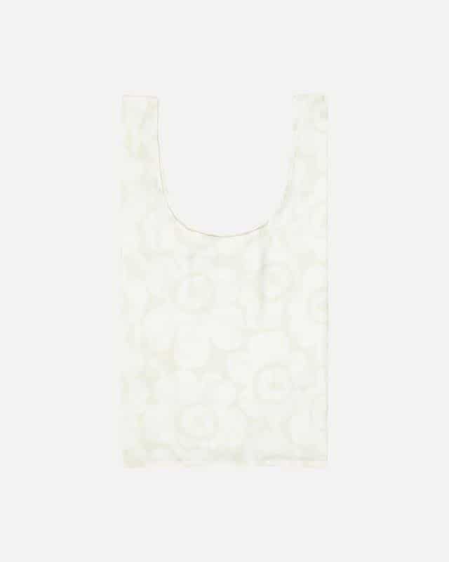 Smartbagen er laget av resirkulert polyester i Unikko-mønsteret. Når den ikke er i bruk, kan den brettes sammen og oppbevares i innerlommen.