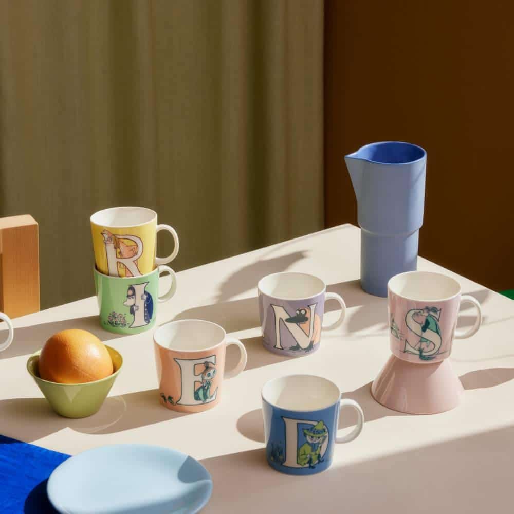 Kruset er en del av Moomin Alphabet-kolleksjonen til Moomin by Arabia.