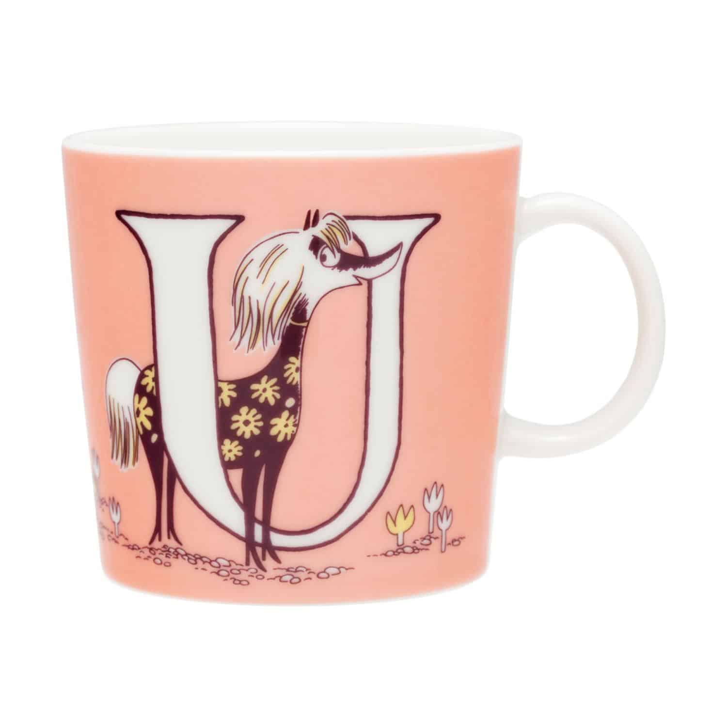 Moomin by Arabia introduserer nye bokstaver til samlingen, og du kan nå stave ordet FAMILY med alfabetkrusene! I U-kruset møter du Primadonna og hesten hennes.