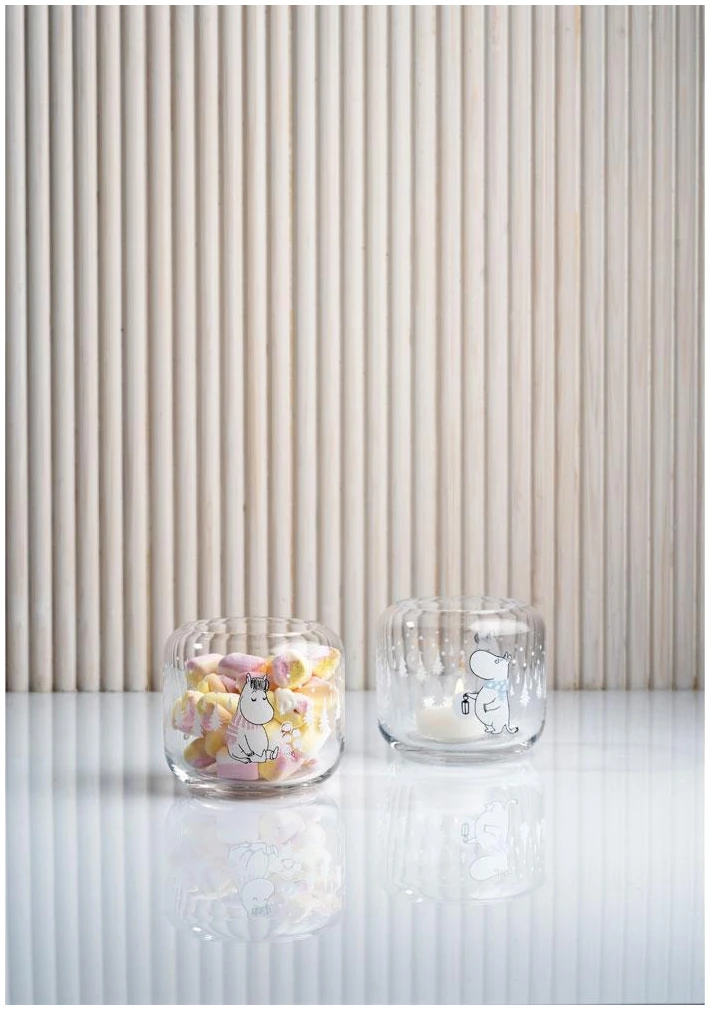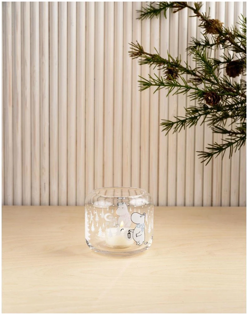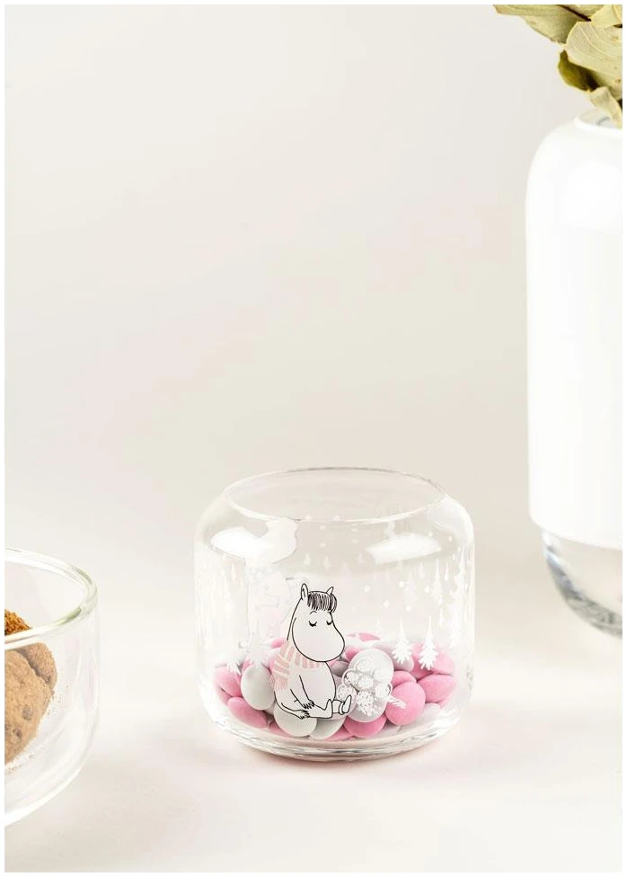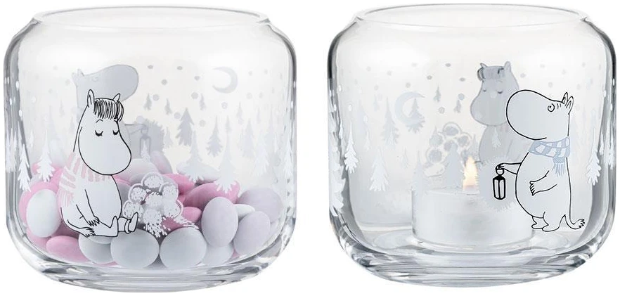 Telysholder i pastellfarger med Mummitrollet og Snorkfrøken i en skog full av juletrær. Den kan også kan brukes som godte- eller nøtteskål.