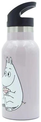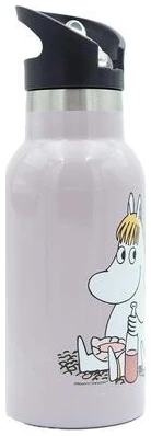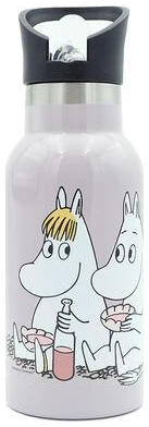 En hendig og fin drikkeflaske av rustfritt stål med motiv av Snorkfrøken og Mummitrollet som holder godt på kalde drikker.