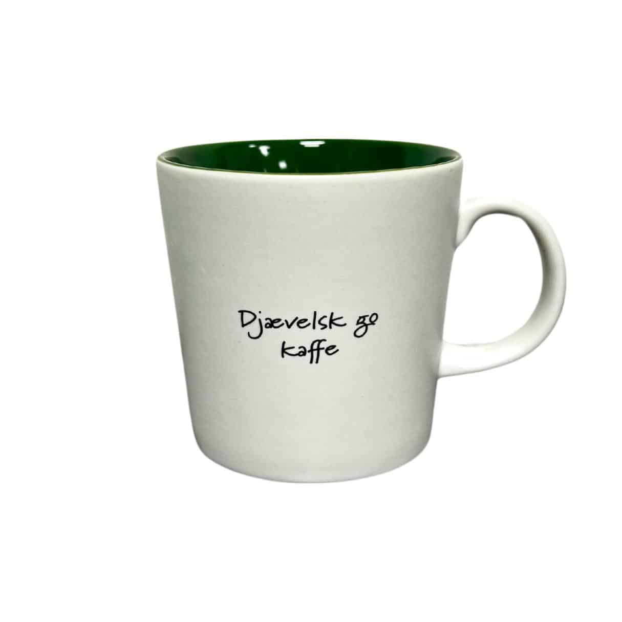 Vekk morgenkaffen til live med et smil! Våre krus er dekortert med tradisjonsrike nordnorske uttrykk på den ene siden og deres humoristiske «oversettelser» til bokmål på den andre. Dette kruset består av det nordnorkse uttrykket «Djævelsk god kaffe», som kan oversettes til «Veldig god kaffe» på bokmål. Perfekt for morgenkaffen eller ettermiddagste, våre krus er en hyggelig påminnelse om den unike nordnorske sjarmen og humor.