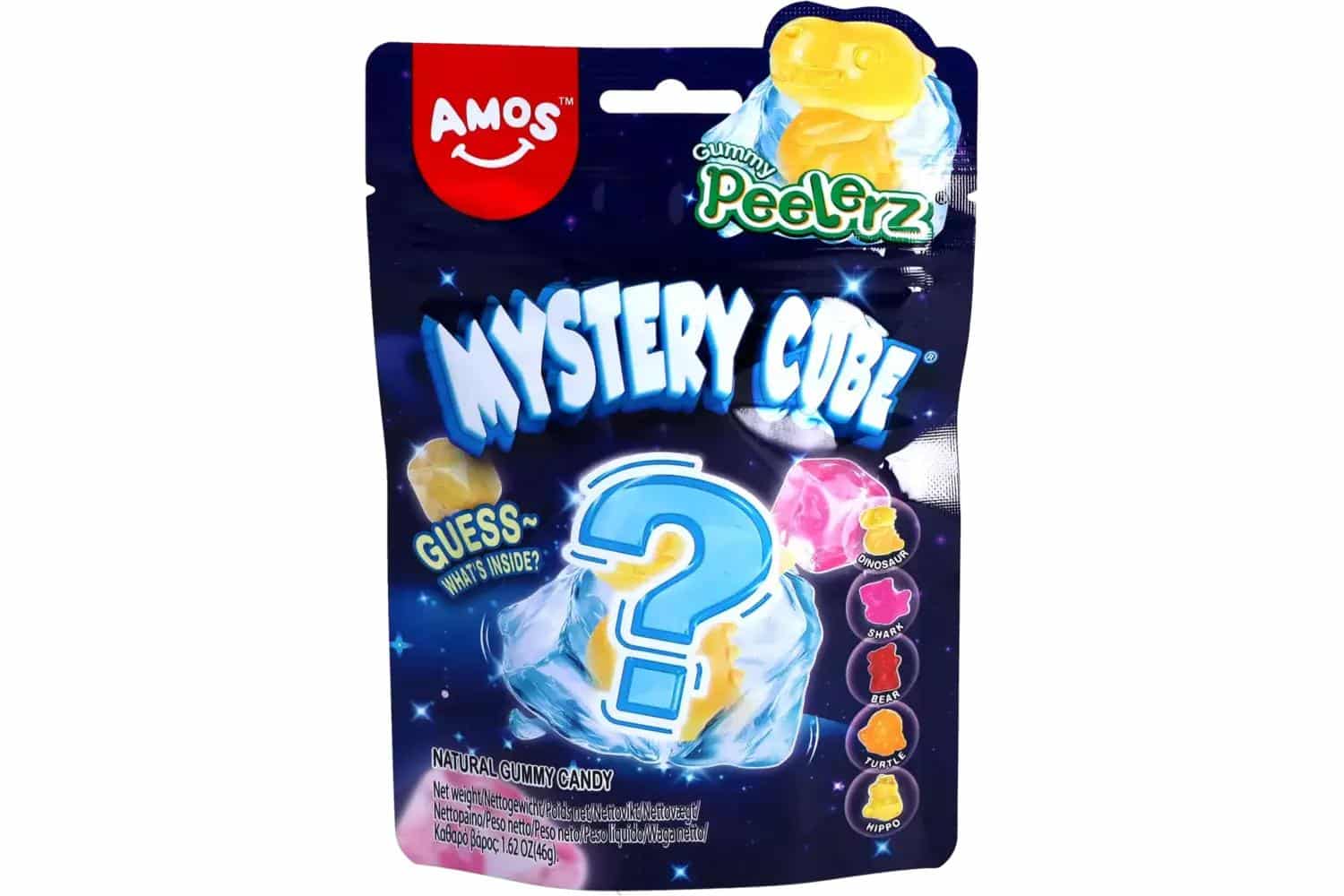 Amos Peelerz Mystery Cube skjuler en overraskelse inni! Hver terning inneholder en tilfeldig dyreformet vingummi med et avskallbart lag i en mystisk fruktsmak.