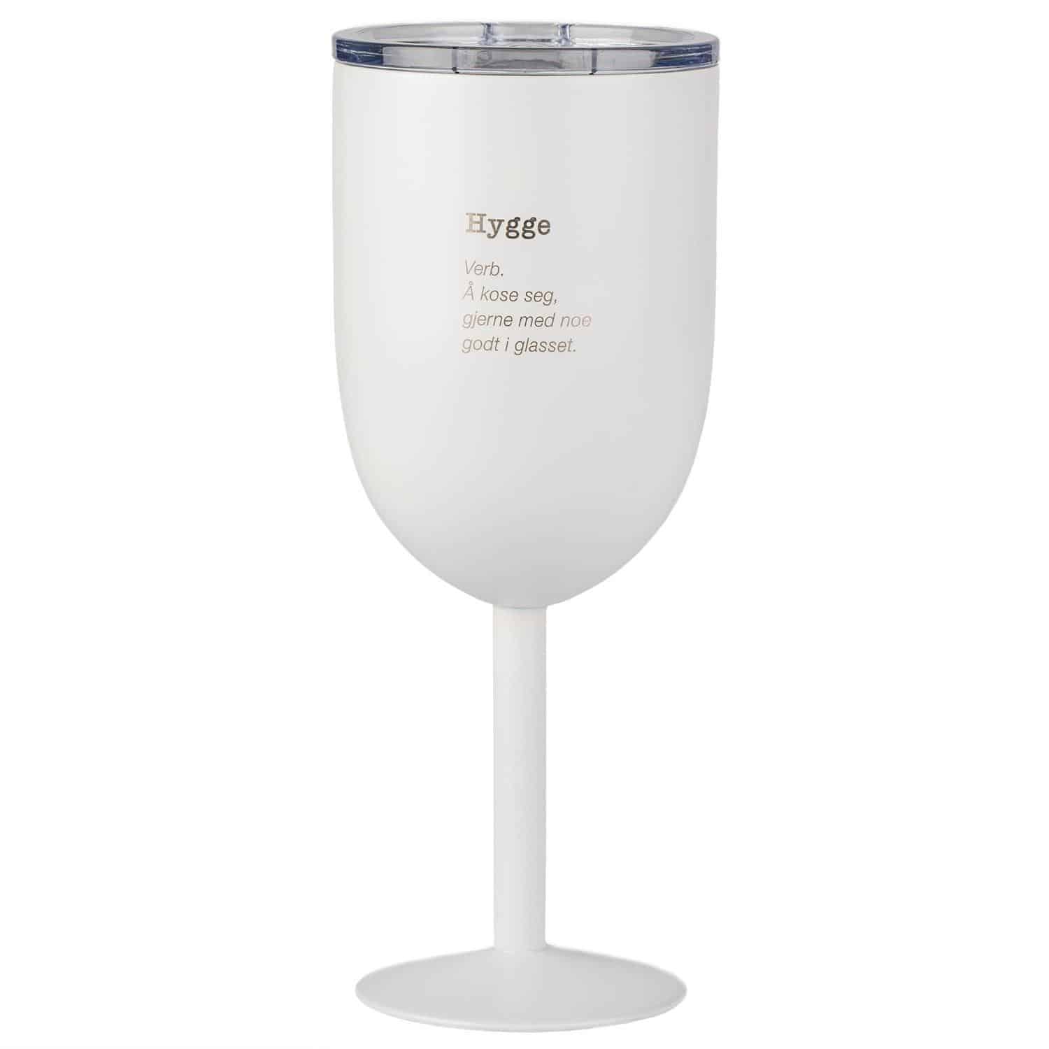 Med HYGGE termo-vinglass holder drikken seg kald. I tillegg slipper du insekter som lurer seg ned i drikken din, siden glasset kommer med praktisk lokk med lukkemekanisme. Glasset er laget av rustfritt stål med dobbeltisolerte vegger. Vinglasset har en matt hvit farge. Teksten er lasergravert og sølvfarget.