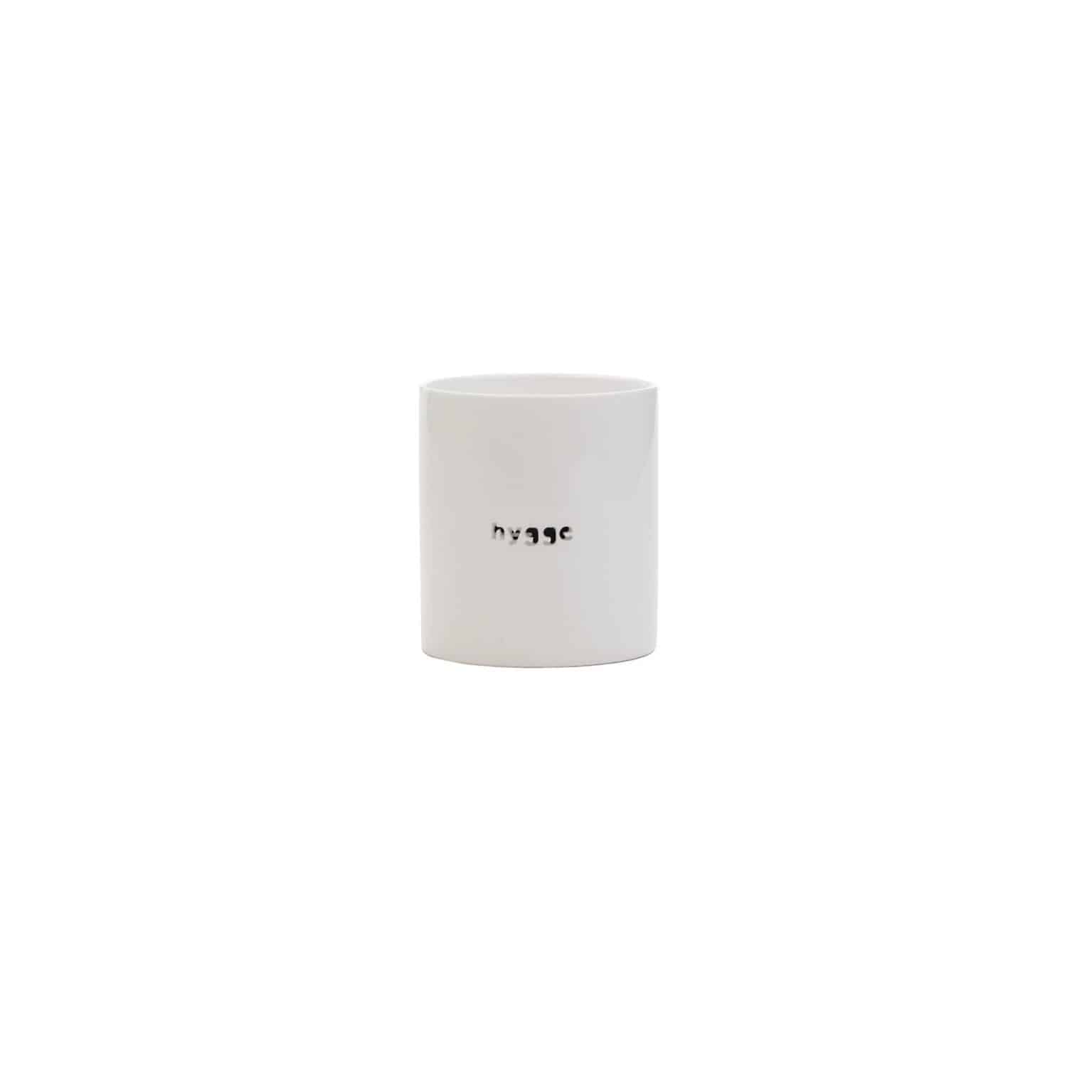 Sögne Telysholder i hvit keramikk med teksten «hygge»
