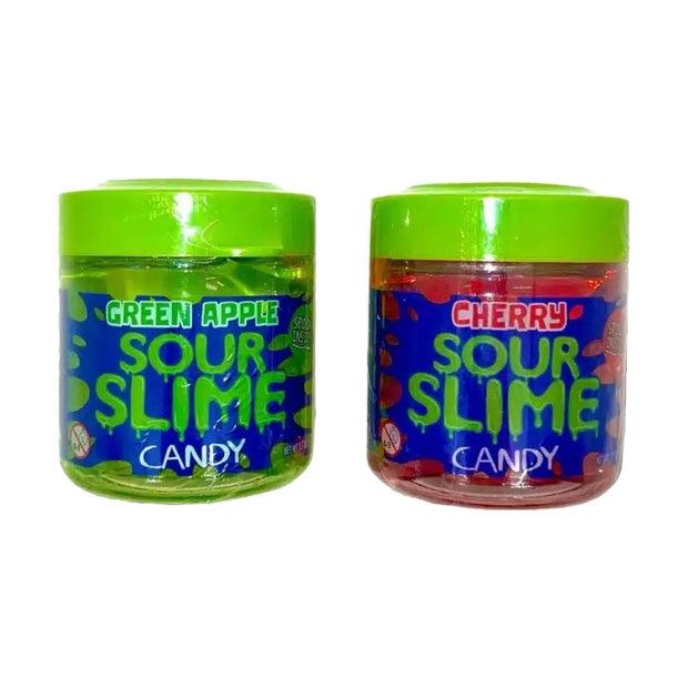Surt, spiselig slim. Det er surt, søtt og slimete morro. Hver boks inneholder surt slim med grønn eple eller kirsebær smak og det følger med skje. Du får en tilfeldig smak ved bestilling.
