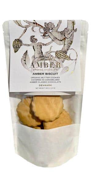 Økologiske biscuits fra Lonlay-l’Abbaye i Normandie, overtrukket med den unike Amber Classic-sjokolade. En raffinert smaksopplevelse med dybde fra den karamelliserte Amber Classic-sjokoladen, samt tekstur og umami fra cookies!