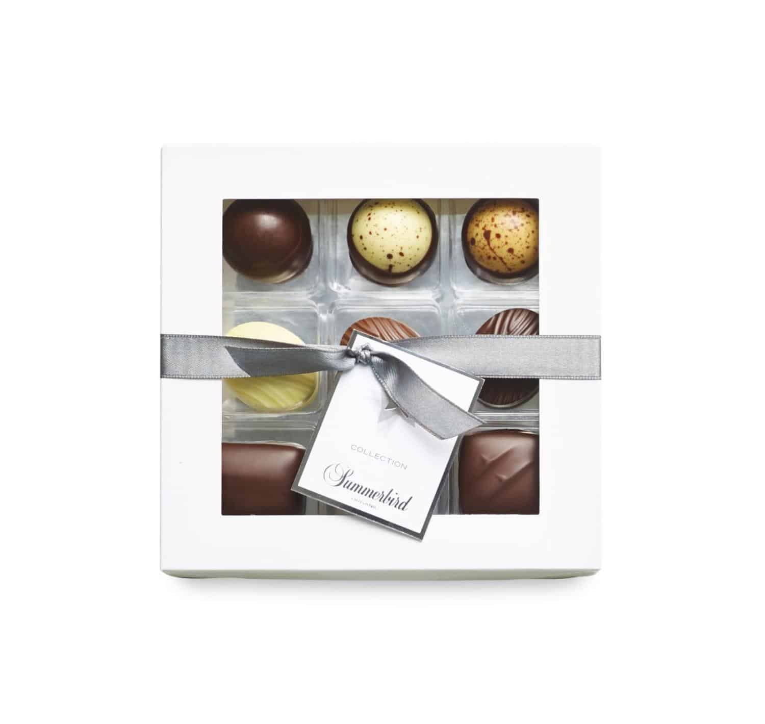 Klassisk, raffinert og vakker gaveeske med 9 biter av Summerbirds unike, økologiske fylte sjokolader.