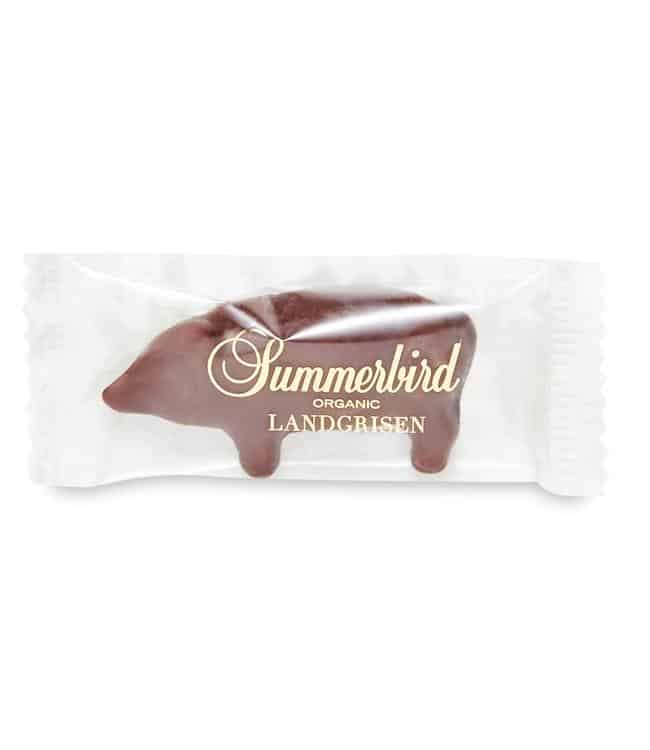 Små vakre landgriser – enkelt innpakket og perfekt som et lite stykke til kaffen – litt ekstra til pakkekalenderen eller bare fordi. Grisen består av økologisk marsipan laget av de fineste spanske mandlene overtrukket med Summerbirds mørk sjokolade Peru 61%.