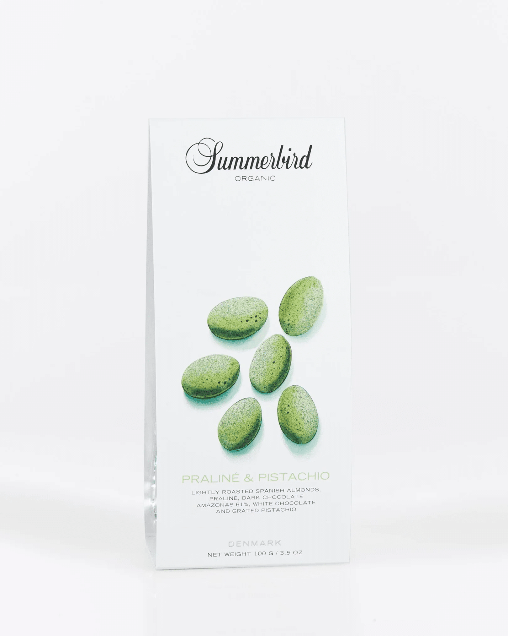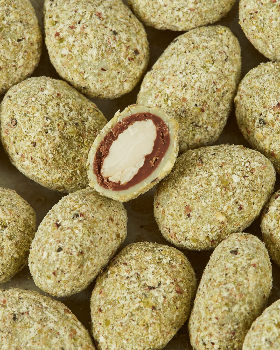 Lett ristede spanske mandler, praliné, mørk sjokolade Amazonas 61 %, hvit sjokolade og revet pistasj.