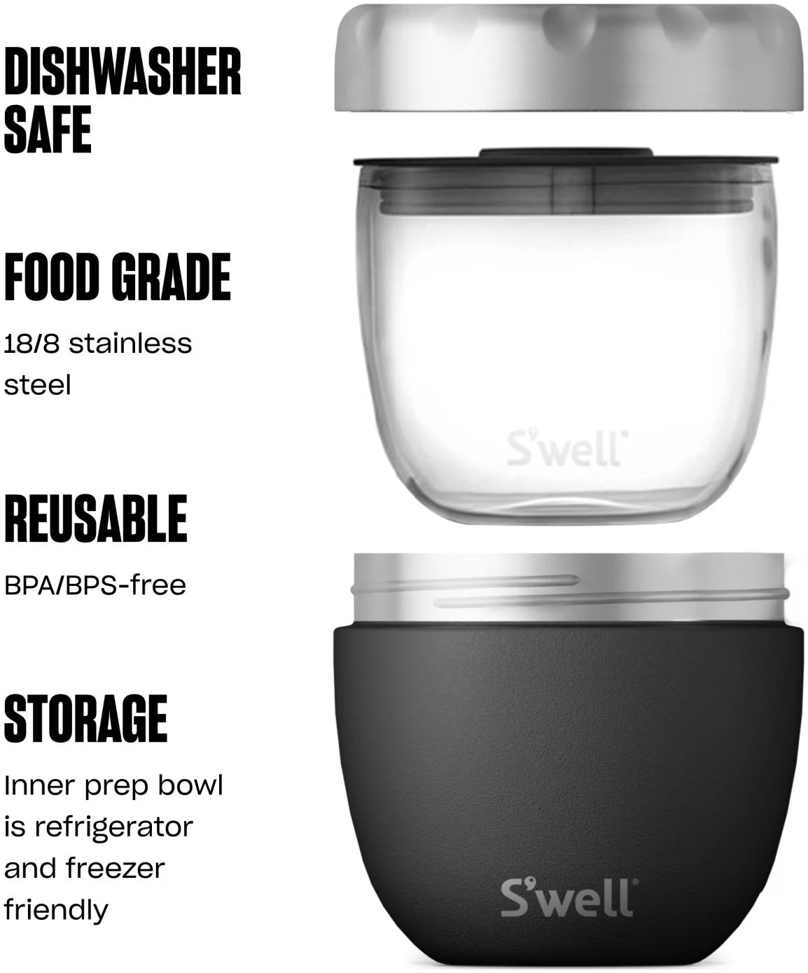 S’well Eats er gjenvinningsbare oppbevaringsbokser til mat i unike design. Med Therma-S’well®-teknologi holder maten seg kald i opptil 11 timer og varm i opptil 7 timer. De er laget av høykvalitativt rustfritt stål og er frie for BPA. Triple innervegger for maksimal isolering, og etterlater derfor ingen kondens på utsiden.