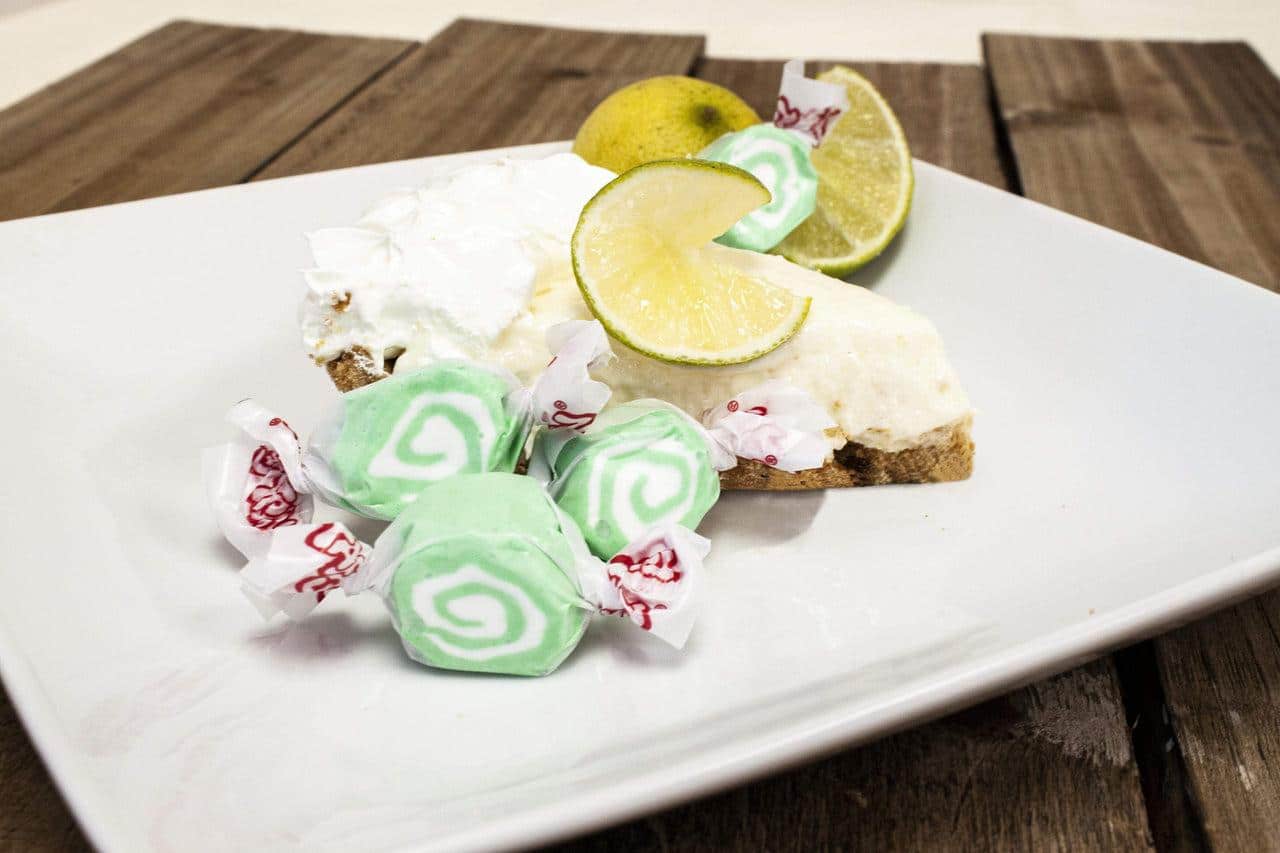 Taffy Towns Key Lime er smaksatt taffy som kommer i et virvlet design med grønne og hvite mønstre og tilbyr en klassisk syrlig smak blandet med signaturoppskriften på saltvannstaffy!