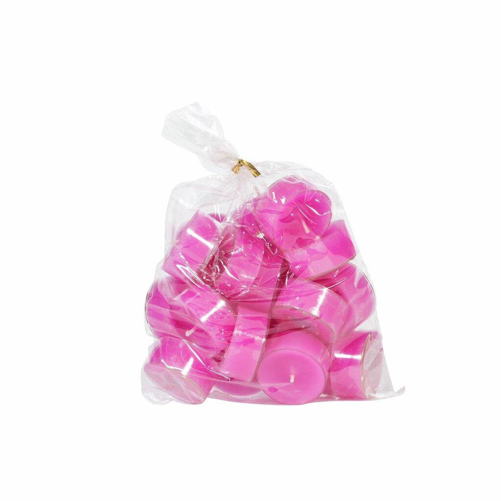 20 stk rosa telys av parafin i pose. Plastkoppen er gjennomsiktig så fargen på lyset sees.
