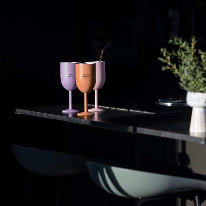 Med VELFORTJENT PAUSE termo-vinglass holder drikken seg kald. I tillegg slipper du insekter som lurer seg ned i drikken din, siden glasset kommer med praktisk lokk med lukkemekanisme. Glasset er laget av rustfritt stål med dobbeltisolerte vegger. Den friske fargen kombinert med sort tekst gir glasset et moderne og elegant utseende.