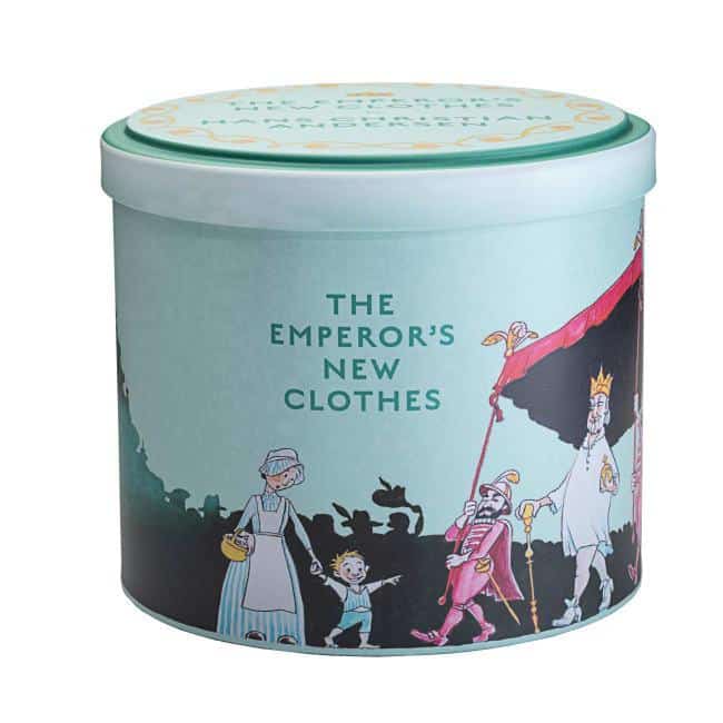 Tinnboksen er designet av Carl Quist-Møller, og er inspirert av HC Andersen sitt eventyr om Keiserens Nye Klær! Boksen er perfekt til gjenbruk.