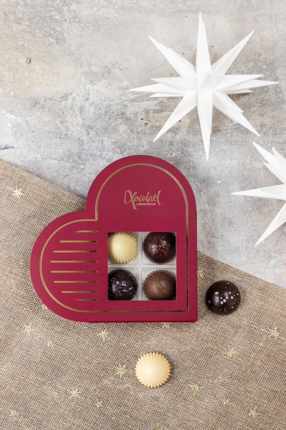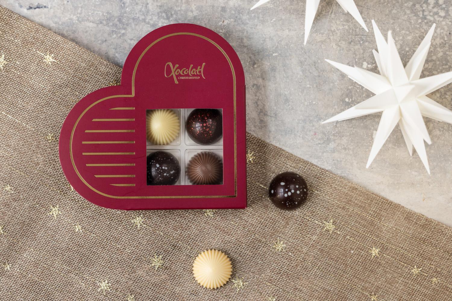 Xocolatl Red Heart inneholder 4 fylte konfektbiter med nougat, lakris, kokos og karamell.
